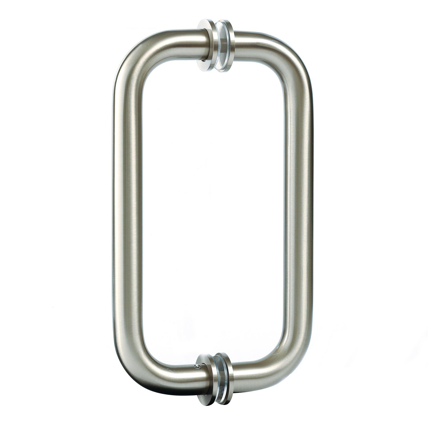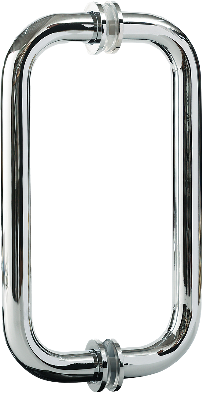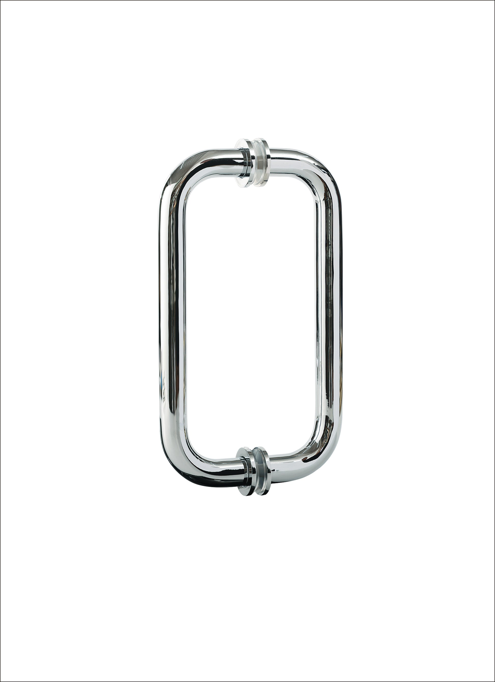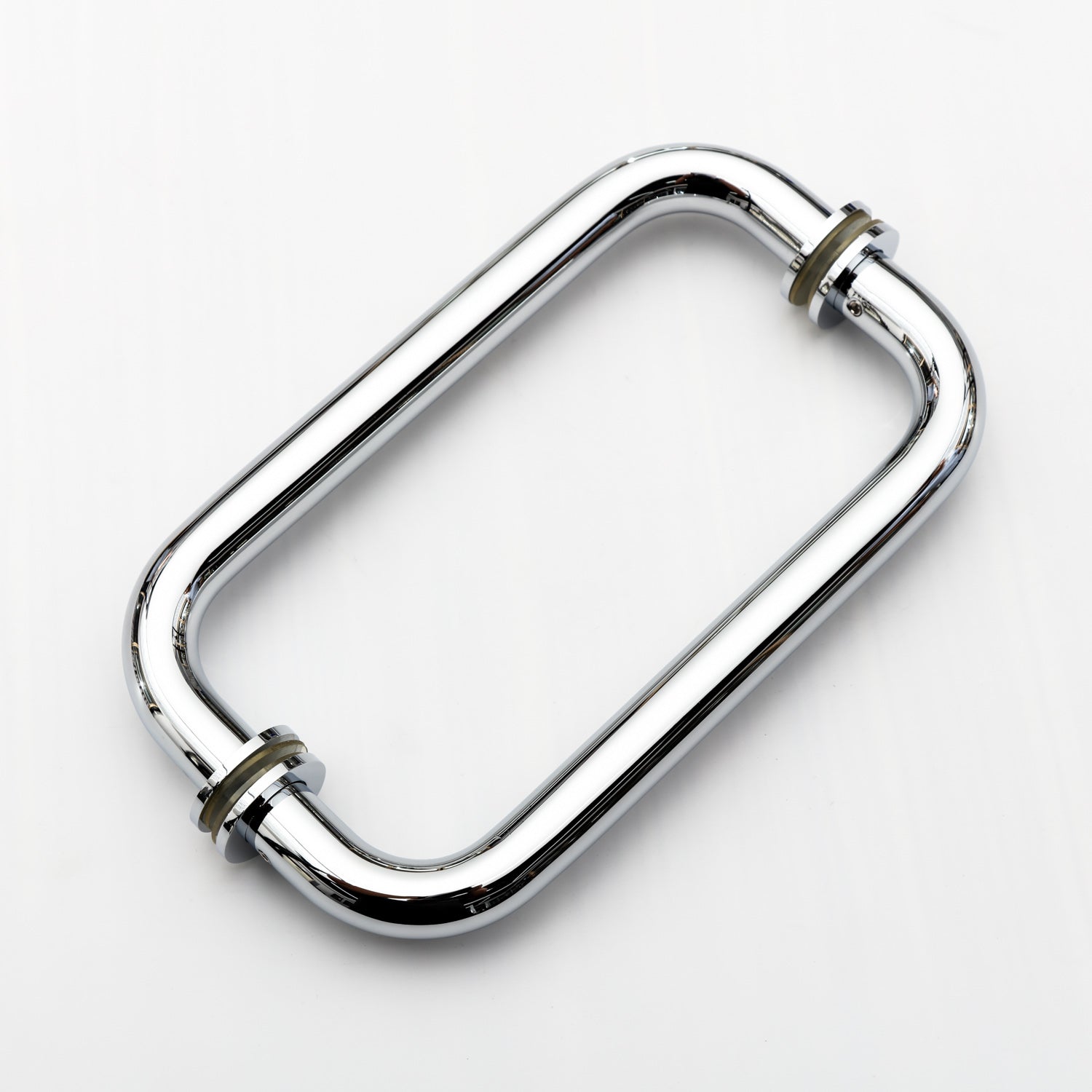 The Premium Tubular Back-to-Back Handles with Style Washers in 8" Size. Classic Style Pull featuring 1-1/4" (32 mm) diameter metal washers. The Back-to-Back Handle comes with a pull on both sides of the door, making it a popular choice for frameless shower door installations. All Pull Handles are available in 8" (152 and 203 mm) sizes, with finishes that complement most bathroom styles.